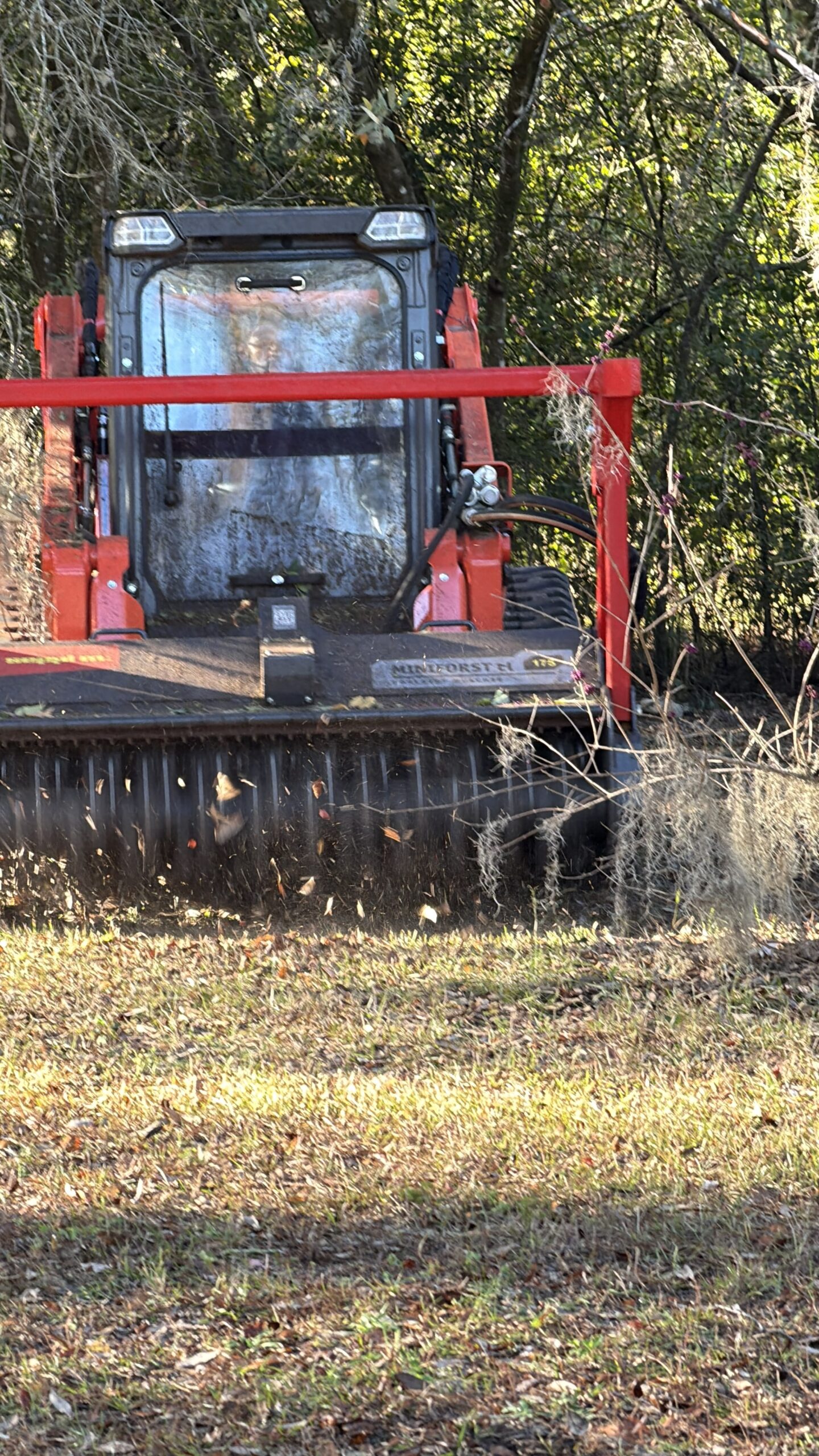 A forestry mulcher is a tracked machine with a high-speed rotating drum covered in carbide-tipped steel teeth. When those teeth contact vegetation, they shred it into chips almost instantly. For typical Florida residential and agricultural lots, the machine works in deliberate passes — methodically covering the property from one end to the other.